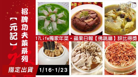 只要329元起即可享有【元記】原價最高4,500元2017年菜系列:(A)招牌功夫菜1道/6道/8道/10道/(B)經典湯品1道/2道/(C)頂級招牌經典佛跳牆1道/(D)招牌功夫菜1道/2道+經典湯品1道/(E)招牌功夫菜1道/2道+頂級招牌經典佛跳牆1道/(F)招牌功夫菜1道/2道/4道+經典湯品1道+頂級招牌經典佛跳牆1道,多款菜色任選?